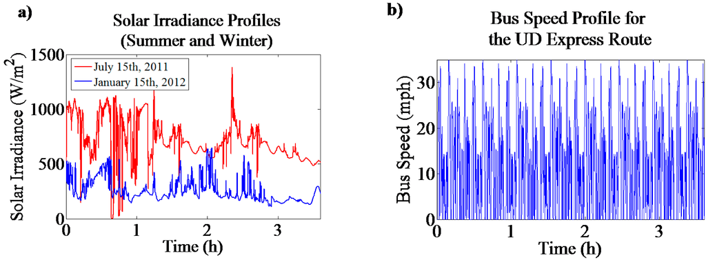 (a) Actual solar irradiance data used to simulate bus operation with a roof-installed PV array, during the summer (red), and winter (blue). (b) Actual bus speed data used to simulate typical bus traction power demands.