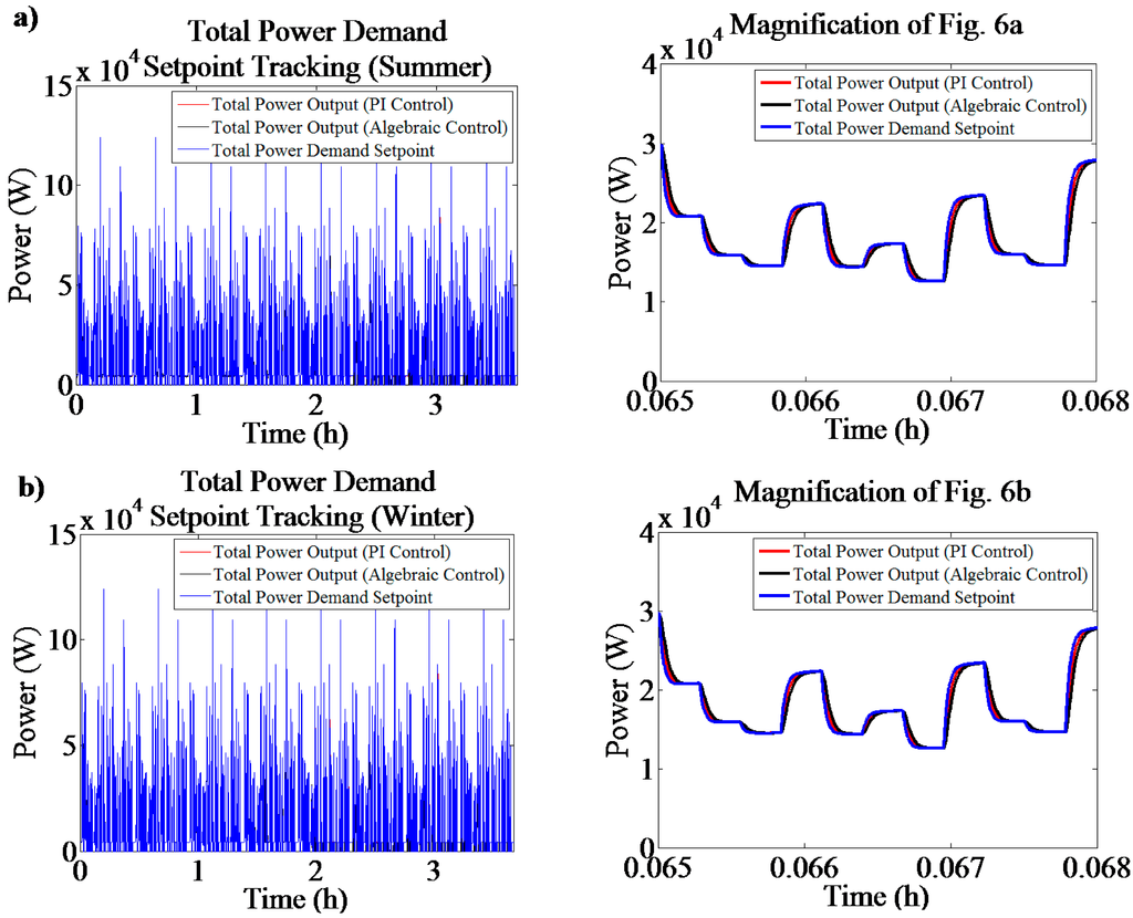 Total power demand set point tracking for the bus using the algebraic and PI control strategies: (a) summer operation and (b) winter operation. The magnified plots show details of controller performance, how rapid changes in bus speed (hence power demands) were tracked reasonably well.