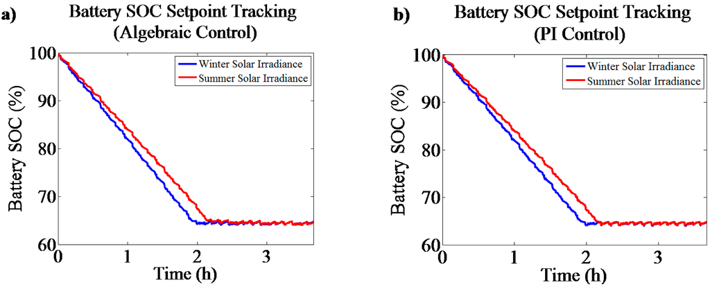Battery state of charge of the PV/fuel cell/battery bus operations under standard conditions: Simulation results using (a) algebraic control and (b) PI control. Each control strategy is effective in maintaining the battery SOC close to the desired 65% for both summer and winter solar irradiance profiles.