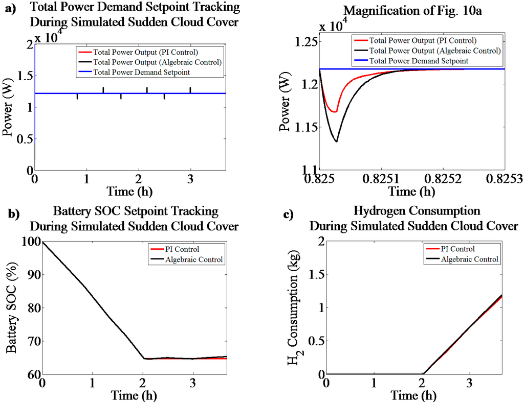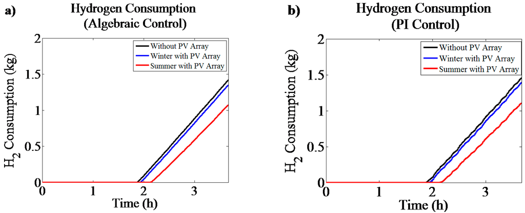 As expected, observe that regardless of control strategy, the addition of a PV array to the fuel cell/battery bus decreases the amount of hydrogen required by the fuel cell (Figure 8). More specifically, for this particular system, the introduction of supplemental PV power reduces hydrogen consumption by approximately 5% in the winter and approximately 25% in the summer, regardless of control strategy.