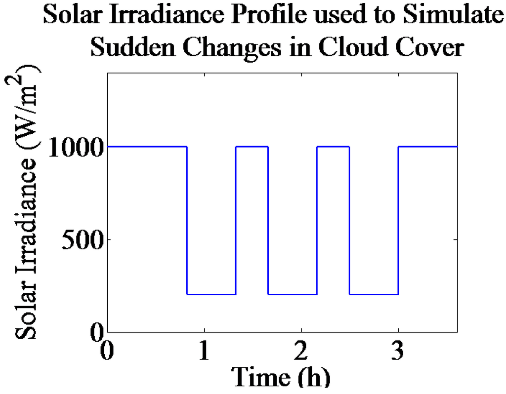 Each component module is modeled mathematically and connected appropriately in Simulink to simulate the entire process. The battery, fuel cell, and traction motor models used here are described in reference [24]. Time delays due to hydrogen transport and fuel cell activation were not included in the fuel cell model because previous work has shown that simulation fidelity is not affected significantly by whether these delays are represented explicitly or not [23]. However, the dynamic lag between requested fuel cell power and actual fuel cell power delivered, which is important to performance, is incorporated in the form of a first order transfer function with a steady-state gain of 1 and time constant, 5.5 s. while the PV array model is based on reference [25]. All parameter values used in the PV array model are identical to those in [25] with the exception of the ideality factor (), the short-circuit current temperature coefficient (), and the short-circuit current under standard test conditions (), whose values were changed from the published 1.6, 0.0017 A/°C, and 3.21 A, to 1.3, 0.003 A/°C, and 10 A, respectively, to be consistent with the characteristics of the PV array considered here.