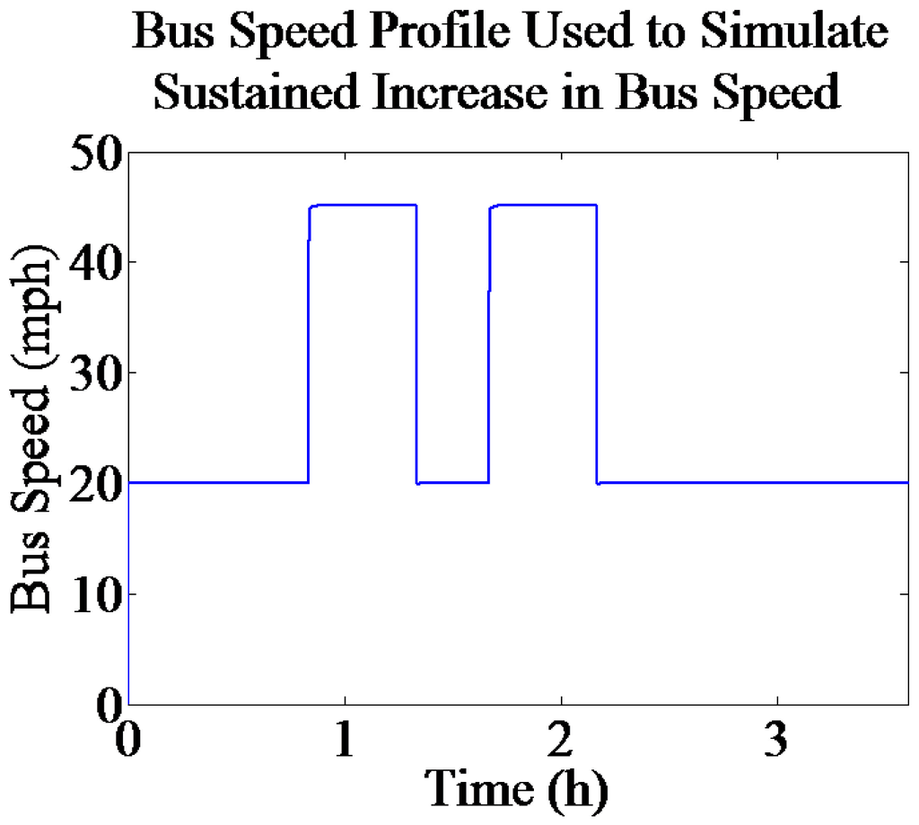 To evaluate the performance of the algebraic and PI control strategies during typical operation in summer and winter, the bus operation is simulated using real solar irradiance (Figure 5a), bus speed (Figure 5b), and ambient temperature data over the indicated period. Solar irradiance measurements are obtained at half second intervals while the bus is driven on its typical shuttle route (the UD express route) between 12:00 p.m. and 3:40 p.m., using an SP-215 Apogee pyranometer installed on the roof of the bus. (The summer data were acquired on 15 July 2011; the winter data on 15 January 2012.) The bus speed is measured with an onboard GPS device. The summer and winter ambient temperatures are set as 301.24 K and 270.23 K, respectively, the averages of hourly temperature data collected in Wilmington, DE, by meteorologists at the New Castle County Airport between 12:00 p.m. and 4:00 p.m. on 15 July 2011 and 15 January 2012.