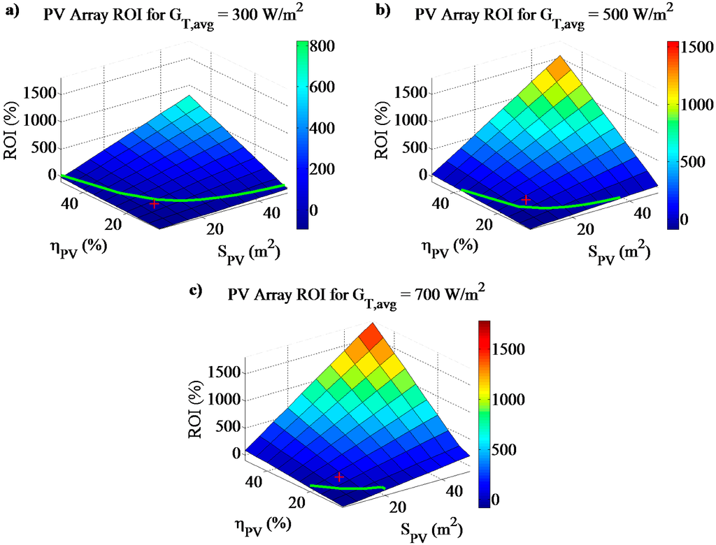 Plots of return on investment (ROI) as a function of PV efficiency () and PV surface area () for three different values of average solar irradiance () during bus operation: (a) 300 W/m2; (b) 500 W/m2; and (c) 700 W/m2. The green line in each figure represents the intersection between the ROI = 0% plane and the ROI surface plot. The red plus sign in each figure represents the characteristics of the PV array used in this work (