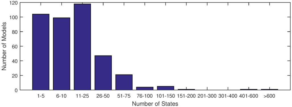 A distribution of model sizes according to number of states from the SBML database.