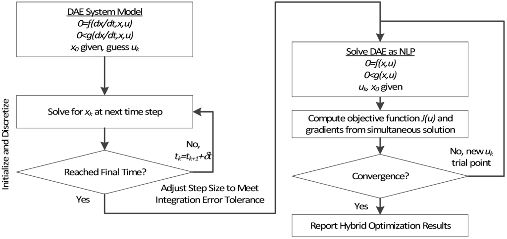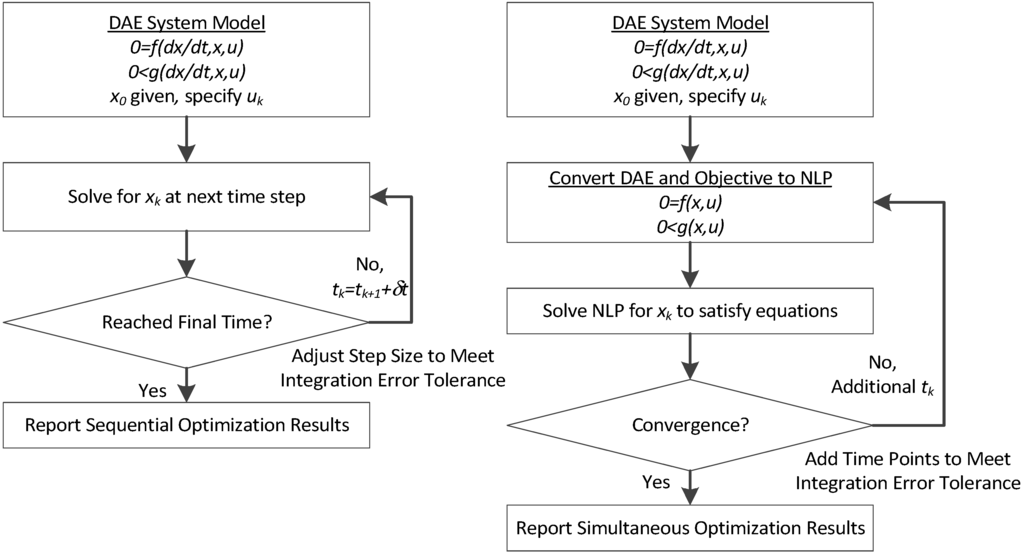 37]. As a result, these methods directly couple the solution of the DAE system with the optimization problem; the DAE system is solved only once at the optimal point, and therefore can avoid intermediate solutions that may not exist or may require excessive computational effort.