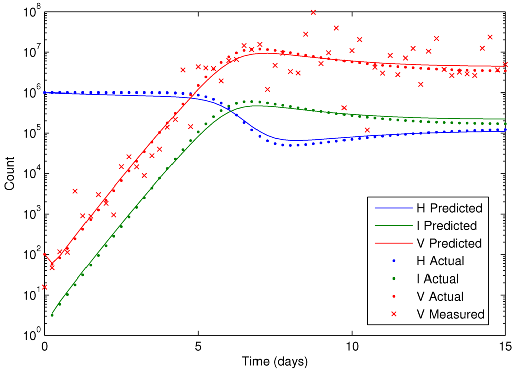 Results of the HIV model parameter estimation, including predicted, actual, and measured virus (V), infected cells (I), and healthy cells (H).