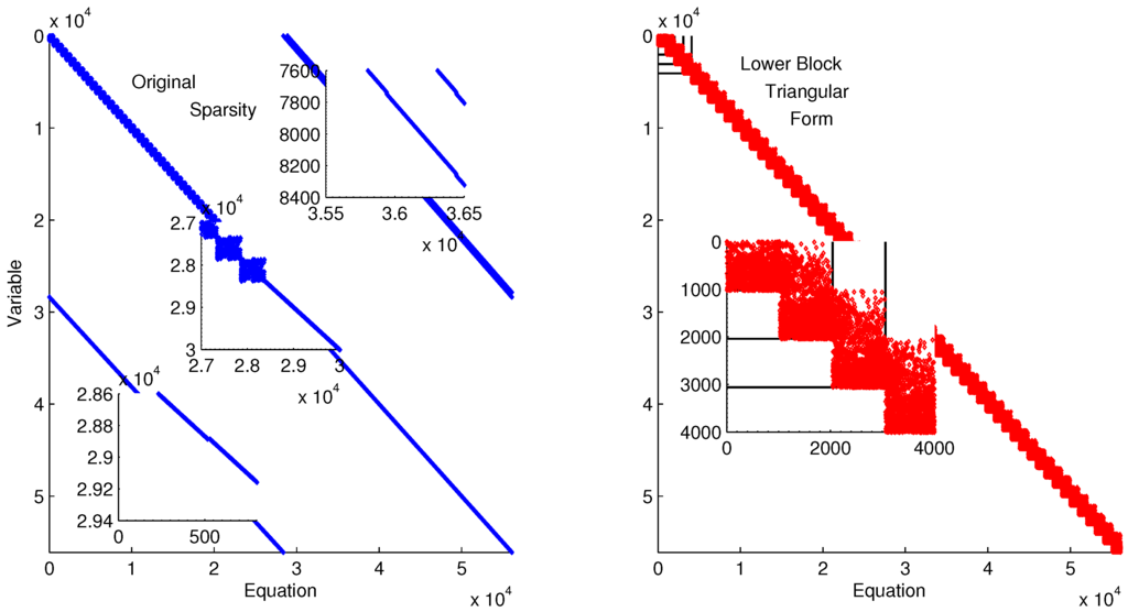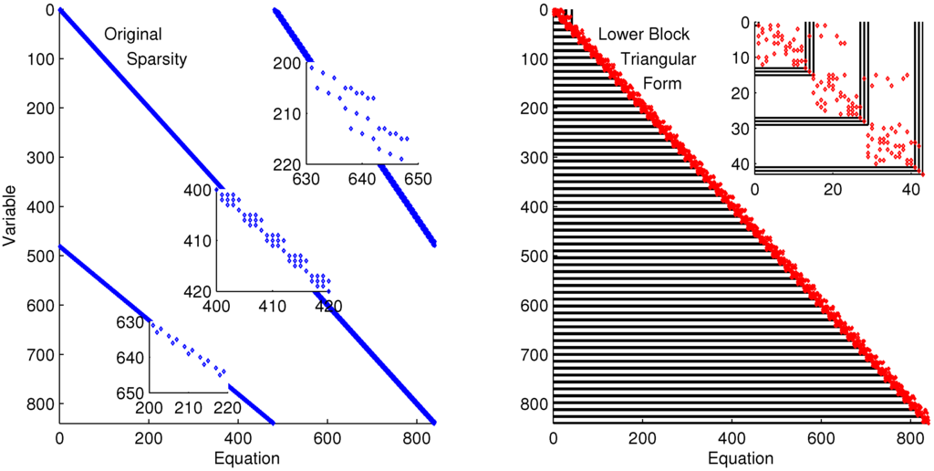 Figure 9 shows the rearranged sparsity pattern with blocks of variables and equations that are solved successively and independently for the purpose of initialization. Full details on the decomposition and initialization method for DAEs are given in a related work [