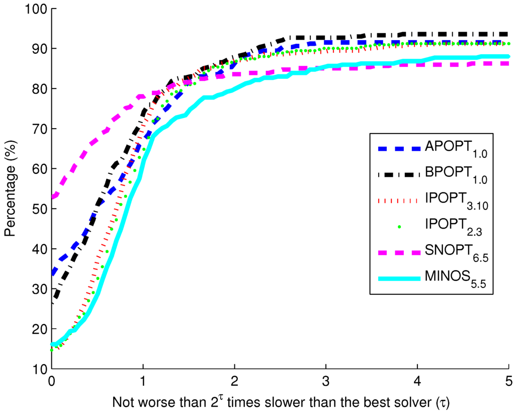 Figure 10. The benchmark indicates that the highest percentage of models solve successfully with BPOPT (interior point SQP method). The solver SNOPT (active set SQP method) has the shortest solution times for a large fraction of the models. This benchmark study points to a number of characteristics of interior point and active set methods for solving large-scale and sparse systems of differential and algebraic equations.