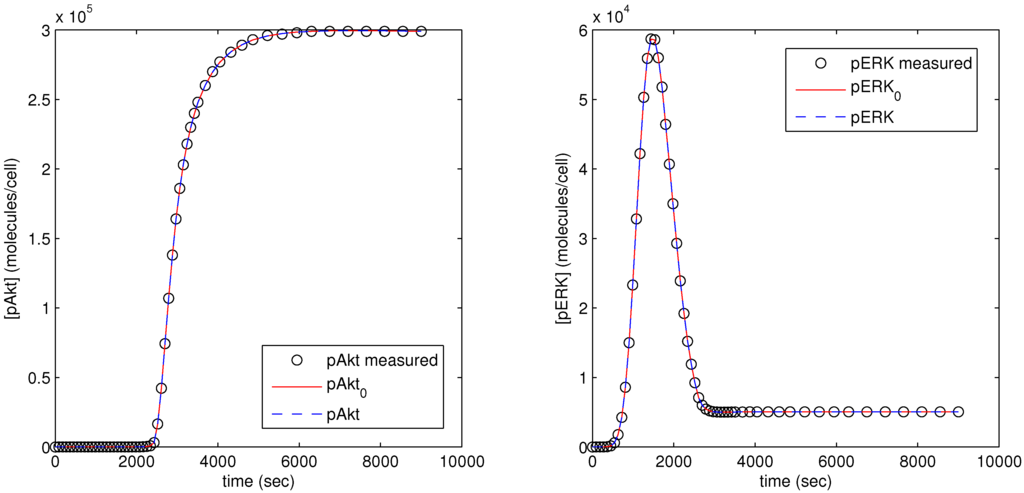 Figure 12, the dots (pAkt measured, pERK measured) represent the measured values of the state variable, the blue line (pAkt, pERK) shows the fit after the parameter optimization, and the red line (