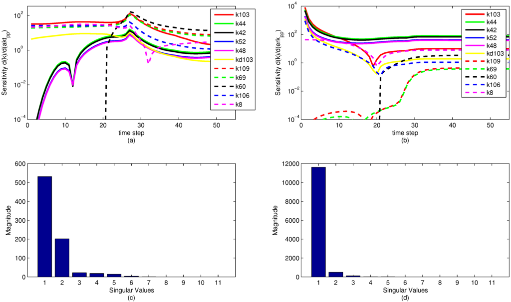 Figure 13 shows that when evaluating the sensitivities with respect to the pERK predicted value, only three of the parameters have a significant influence on the objective, while about six of the parameters have an effect on the pAkt predicted value. The SVD analysis is also informative in minimizing the number of parameters needed for estimation by relating parameters that can be expressed as combinations of sets of other parameters. The methods behind the recombination of parameters are beyond the scope of this paper, but there is a possibility for reformulating models to minimize the model size and number of parameters to be optimized.