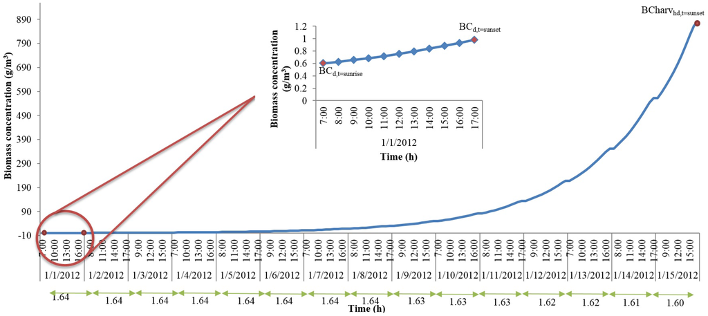 i.e., when harvesting frequency is low, biomass concentration increases until the time of harvest because of accumulation of algae biomass, and hence, growth rates are high. It can also be observed from