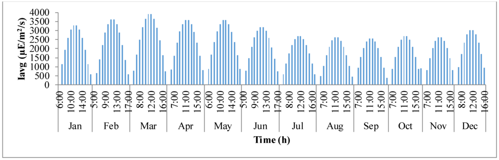 Io). It can be observed that in a representative day, the average light intensity inside the pond gradually increases from the time of sunrise until mid-day and later decreases as the sun goes down. This trend continues for all representative days of the year. However, on an overall scale, the light intensity is maximum inside the pond during the months of February, March, April, and May.