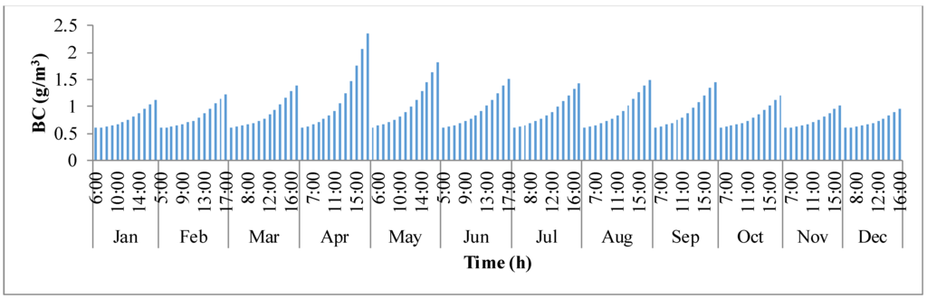 x-axis defines the times in a 24 h format for each representative day of the month and