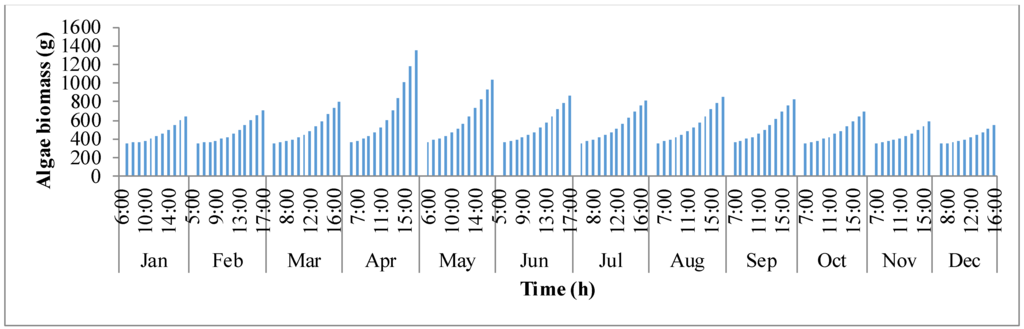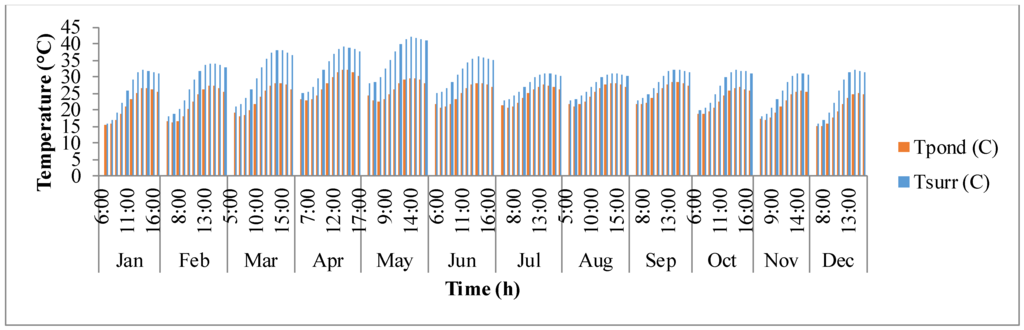 Tpond) with time. Surrounding temperature depends on maximum and minimum temperature of the day, longitude, and time zone. It rises from sunrise until mid-day and then after goes down as the sun goes down. Temperature of the pond is driven by surrounding temperature and thermal gains/losses in the pond due to solar radiation, air radiation, pond radiation, evaporative heat transfer, convective heat transfer, and heat transfer due to inflow water. It is also dependent on the growth rate of algae as shown in Equations (4) and (5). The temperature of the pond rises as the day progresses and reaches a maximum after which it decreases. The decrease in pond temperature is mostly due to the cooling effects of evaporation. It can be observed that the surrounding temperature and pond temperature are high during the warmer months of March, April, and May.