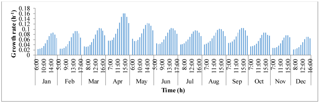 y-axis is the growth rate (μ). For a given day, growth rate of algae biomass tends to increase in the first few hours until mid-day and later decreases. This behavior of deteriorating growth rate is mainly due to the decrease in the pond temperature in the afternoon hours. Algal growth rate is rapid in the summer months of March, April, and May because temperature of the pond oscillated around the optimal growth temperature of