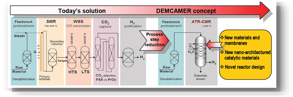 The aim of the DEMCAMER project was to develop innovative multifunctional Catalytic Membrane Reactors (CMR) based on new nano-architectured catalysts and selective membrane materials to improve their performance, cost effectiveness (i.e., reducing the number of steps), and sustainability (lower environmental impact and use of new raw materials) over four selected chemical processes ((Autothermal Reforming (ATR), Fischer-Tropsch (FTS), Water Gas Shift (WGS), and Oxidative Coupling of Methane (OCM)) for pure hydrogen, liquid hydrocarbons, and ethylene production.