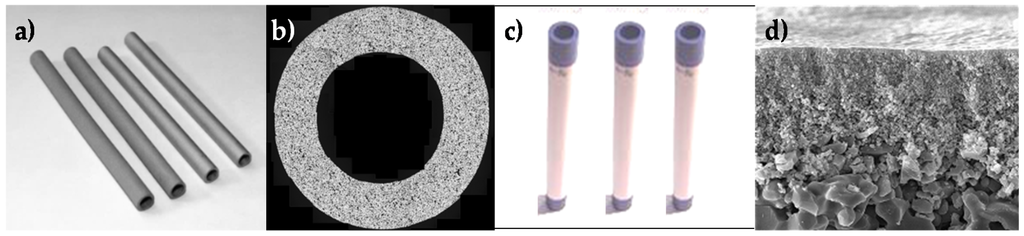 (a) Metal porous supports; (b) Cross section of a metal porous support; (c) Ceramic porous support (50 cm long) and (d) Cross section of the external side of the ceramic porous support showing the 100 nm pore side Al2O3 top layer).