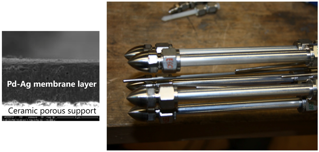 Based on the enhancement in permeances associated to ceramic supports compared to metallic based supports, Pd-based ceramic supported membranes were developed for the lab-scale and prototype reactors using thicker wall supports in order to increase the mechanical properties (a figure with metallic and ceramic supports is depicted in Figure 5).