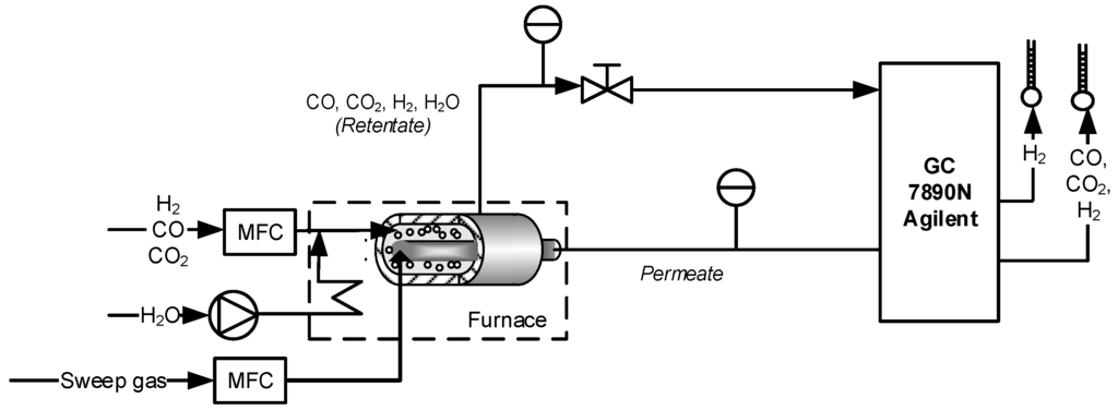 The experimental apparatus used for this investigation is shown in Figure 8. The reactor was placed inside an electric furnace to keep the desired temperature. Three mass flow controllers were used to feed gas mixture into the module, whereas an HPLC pump fed liquid water directly vaporized inside the furnace. The outlet stream flow rates were measured with two bubble soap flow-meters. The feed pressure was regulated by means of a back pressure controller placed on the retentate line, whereas the permeate was kept at atmospheric pressure. The retentate and permeate streams compositions were analyzed by means of a gas chromatograph (Agilent 7890N) with two parallel analytical lines, allowing retentate and permeate streams analyses at the same time. The temperature was measured by using a thermocouple positioned in the middle of the reactor shell (inside the catalyst bed).