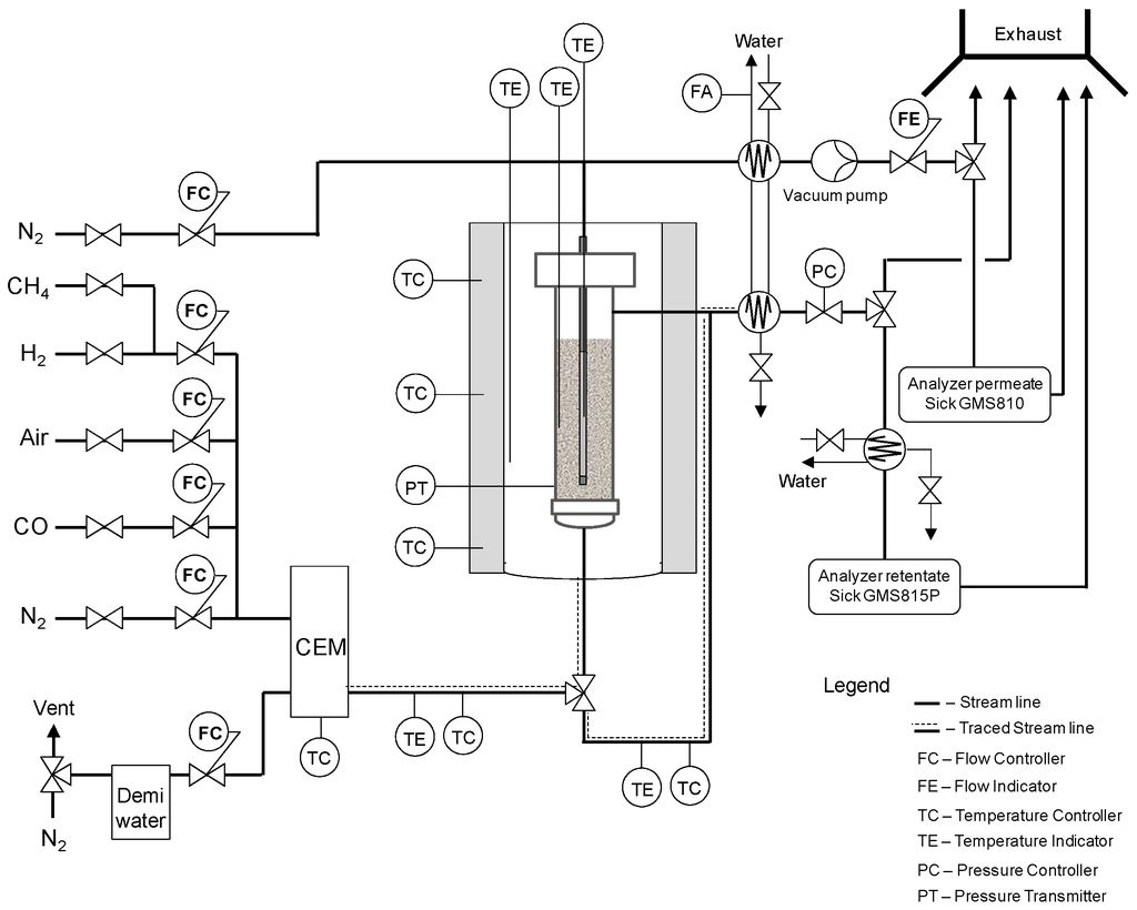 The WGS fluidized bed membrane reactor was performed in an equipment that can be used for testing the permeation properties of the membranes using single gases, simulated mixtures of gases and also in reactive conditions with fluidized catalyst. A shell-and-tube module configuration was constructed centered in an oven with three zone temperature controllers. The reactor is 10 cm i.d. and five ceramic supported Pd-based membranes can be immersed in the bed. The feed flow rate was controlled by digital mass flow controllers and the steam by a Controlled Evaporation and Mixing (CEM) system (Bronkhorst, Frankfurt, Germany). The pressure in the reactor was controlled with a back-pressure regulator after steam condensation. The flow rate at the permeate and retentate streams was monitored by Brooks mass flow meters. To enhance the driving force for hydrogen permeation, the test rig was equipped with a vacuum pump for hydrogen (ATEX certified). The PID for the Reforming Test Setup is shown in Figure 9.