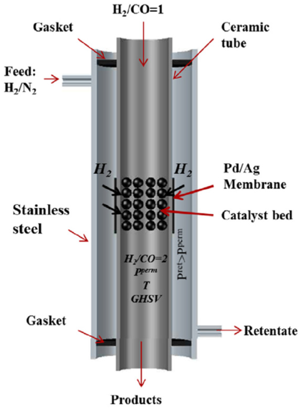 Experiments in the lab scale PB-MR were conducted at temperatures ranging from 250 to 280 °C and 10 bar pressure using a GHVS of 7500 mLfeed/gcat/h. In the packed bed configuration, the catalyst was placed inside the alumina membrane and located in the region of the Pd-Ag membrane in order to allow distributive feeding of H2. The overall syngas ratio H2/CO is obtained by feeding a ratio H2/CO equal to 1 from the inside of the alumina tube and diluted H2 from the shell part as depicted in the figure.