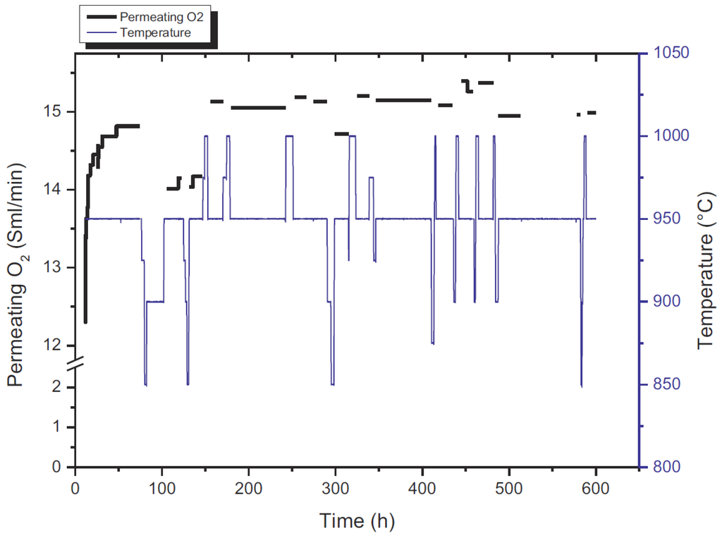 Permeating O2 flow rate in the outlet of the perovskite membrane reactor with 0.5 mm thickness, permeate side [35]. He flow: 100 mL/min, air flow = 500 mL/min.
