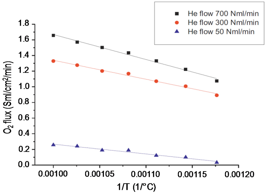 Arrhenius plot for the MIEC membrane (0.5 mm thickness) as a function of He flow rate in the permeate side with an air flow rate of 2000 mLN/min in the retentate [35].