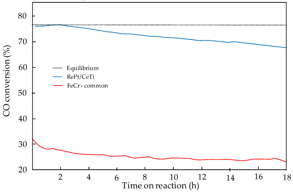 Comparison of CO conversion over the WGS catalyst developed in DEMCAMER and state-of-the-art Fe/Cr catalyst (400 °C, SV = 23,230 L·h−1·kg−1) [18].