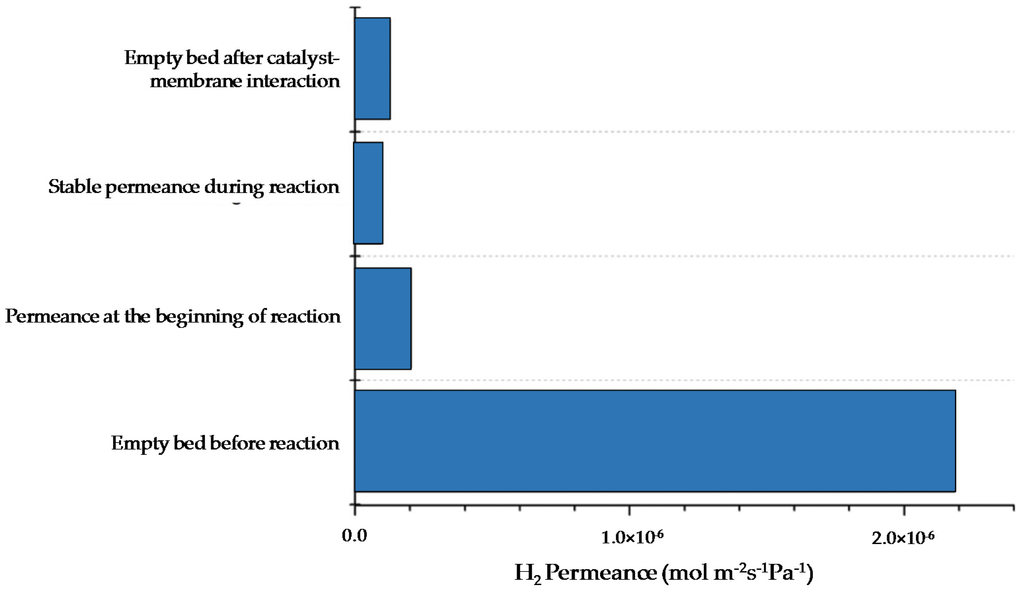Comparison of H2 permeance at different moments in time before and after interaction of the catalyst with the Pd surface (400 °C) [38].