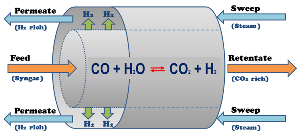 Coal-based IGCC units produce electricity through a synthesis gas (syngas) intermediate, which is subjected to the water-gas shift (WGS) reaction to maximize H2 produced prior to the stream being sent to the gas turbine portion of the unit. An IGCC process scheme with carbon capture typically utilizes packed-bed WGS reactors followed by CO2 removal by a Selexol process [,]. An alternative to this method of syngas conversion utilizes membrane reactors (MRs) equipped with H2-selective membranes, which grant advantages such as increased carbon monoxide (CO) conversion, facilitated CO2 removal/sequestration (CO2-rich effluent is produced at high pressure), and process intensification through a reduction to the total number of process units [,].