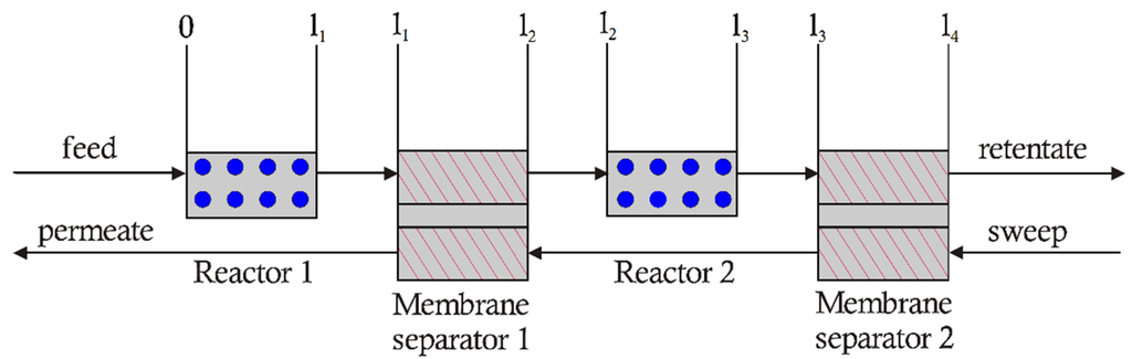 Moreover, several optimization studies relating to packed-bed MRs and reactor systems employing membrane separators are available in the literature. These studies have utilized H2-selective membranes (ceramic or Pd) to formulate optimization problems that examine staged membrane reactors [,,] and traditional MRs []. In the case of the staged membrane reactors, the optimization problems were formulated with the objective of maximizing methane conversion, H2 recovery or H2 yield in a steam methane reforming (SMR) process employing a Pd-based membrane. These studies considered a permeative stage membrane reactor (PSMR) with a fixed number of stages, or a staged membrane reactor (continuous membrane, catalyst packing with inert stages). The decision variables were composed of the catalyst/membrane stage lengths, but the problem was not subject to performance constraints. For the case of the traditional MR performing the WGS reaction, the study formulated an optimization problem in terms of economic variables that maximizes performance (H2 recovery) for the minimum cost (membrane surface area) subject to multiple constraints on reactor effluent streams by considering alternative catalyst/membrane placement about the axial axis of the reactor. With regard to the available literature, it is worth noting that computational studies of SMR or WGS processes that use Pd/micro-porous ceramic membranes have H2 selectivity values that are comparatively larger than those of polymeric membranes.