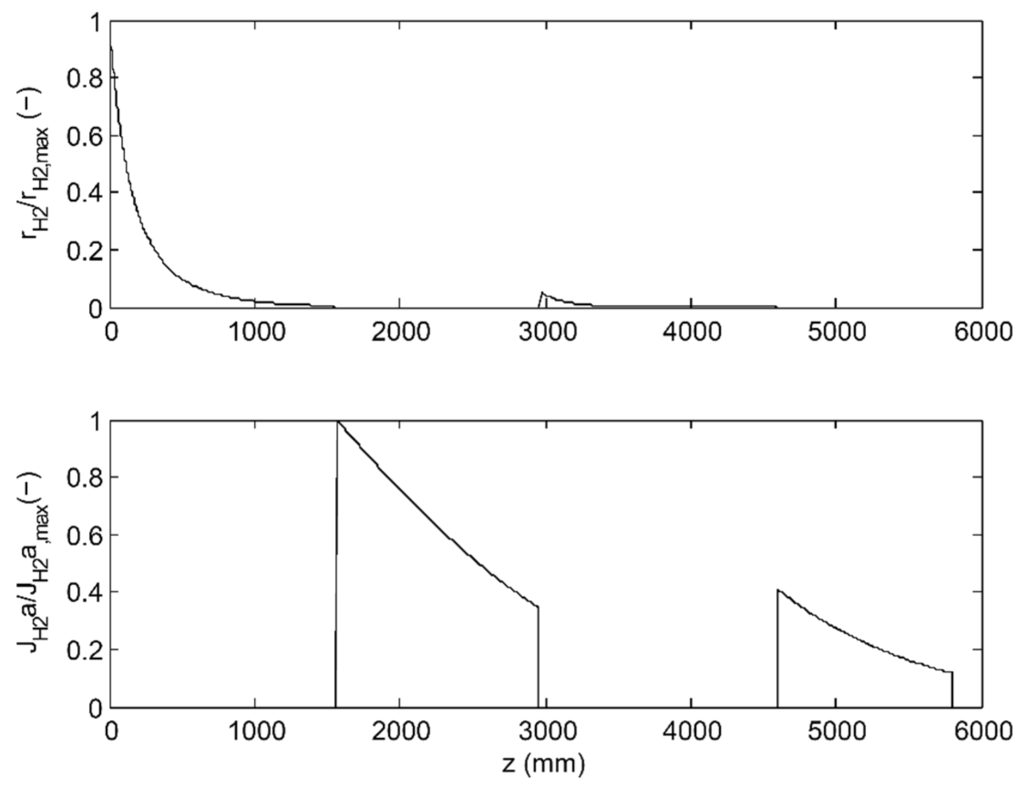 H2 reaction (rH2) and diffusion (JH2a, a ≡ 4/dt) rates as function of axial axis for the optimized 2-stage PSMR (αH2/CO2 = 60); dimensionless quantities scaled by the maximum H2 reaction and diffusion rates, respectively.