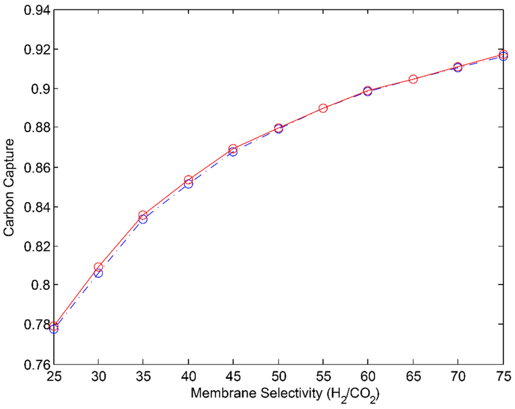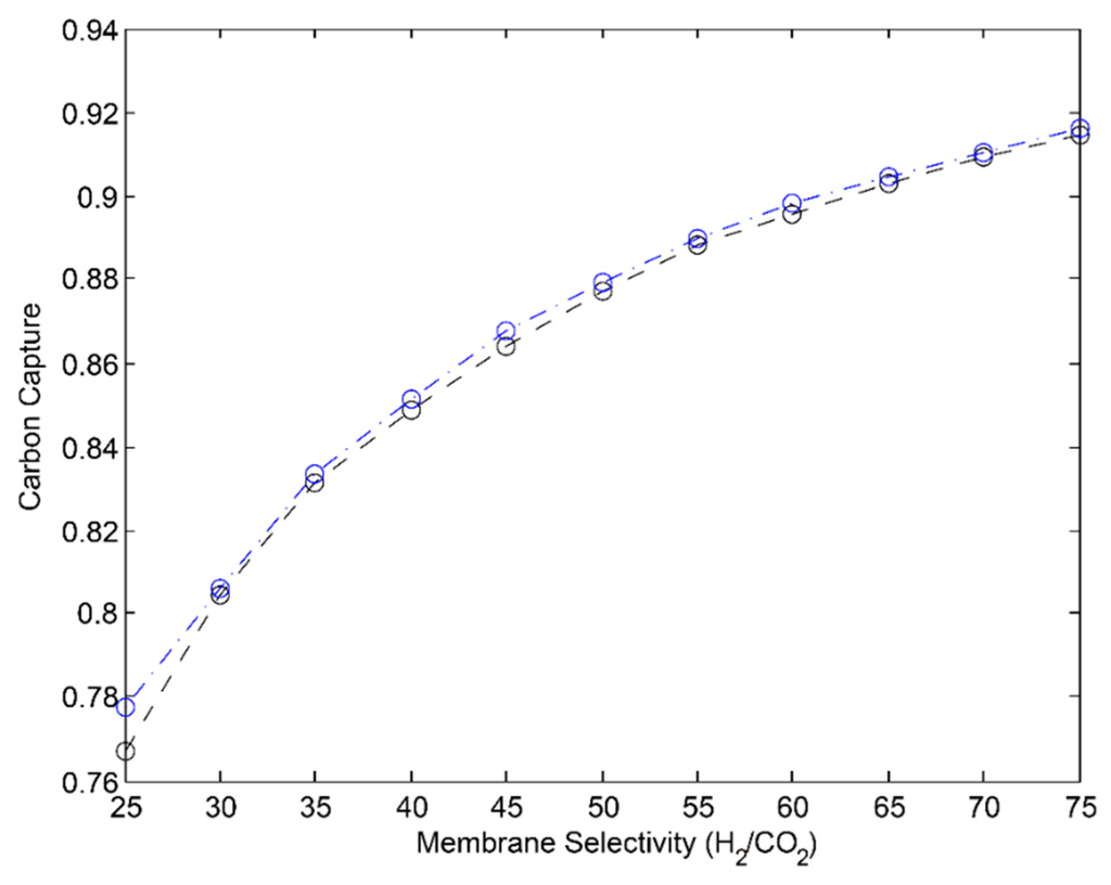 Noting that the material did not satisfy the carbon capture and hydrogen purity constraints, the same procedure outlined above for the 2-stage and 3-stage PSMRs was performed for the MR; that is: incremental variation of H2/CO2 selectivity was performed for the range of α = 25–75 so as to determine the minimum H2/CO2 selectivity that would satisfy the carbon capture and permeate hydrogen purity constraints in an optimized MR. All values of αH2/CO2 greater than 30 satisfied the permeate hydrogen purity constraint, and the carbon capture constraint is satisfied in the range of αH2/CO2 = 60–65, occurring at a value of approximately 61. The carbon capture resulting from varying selectivity on the range of 25–75 in an optimized MR utilizing the minimum membrane area is shown in Figure 11.