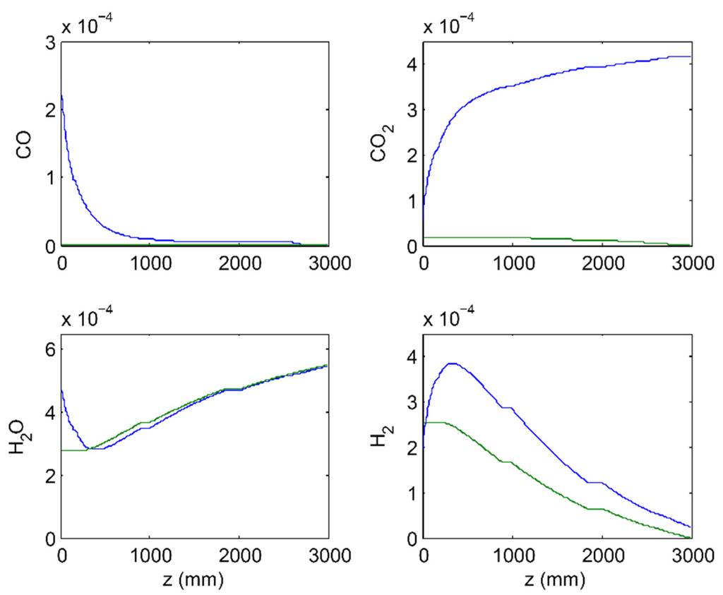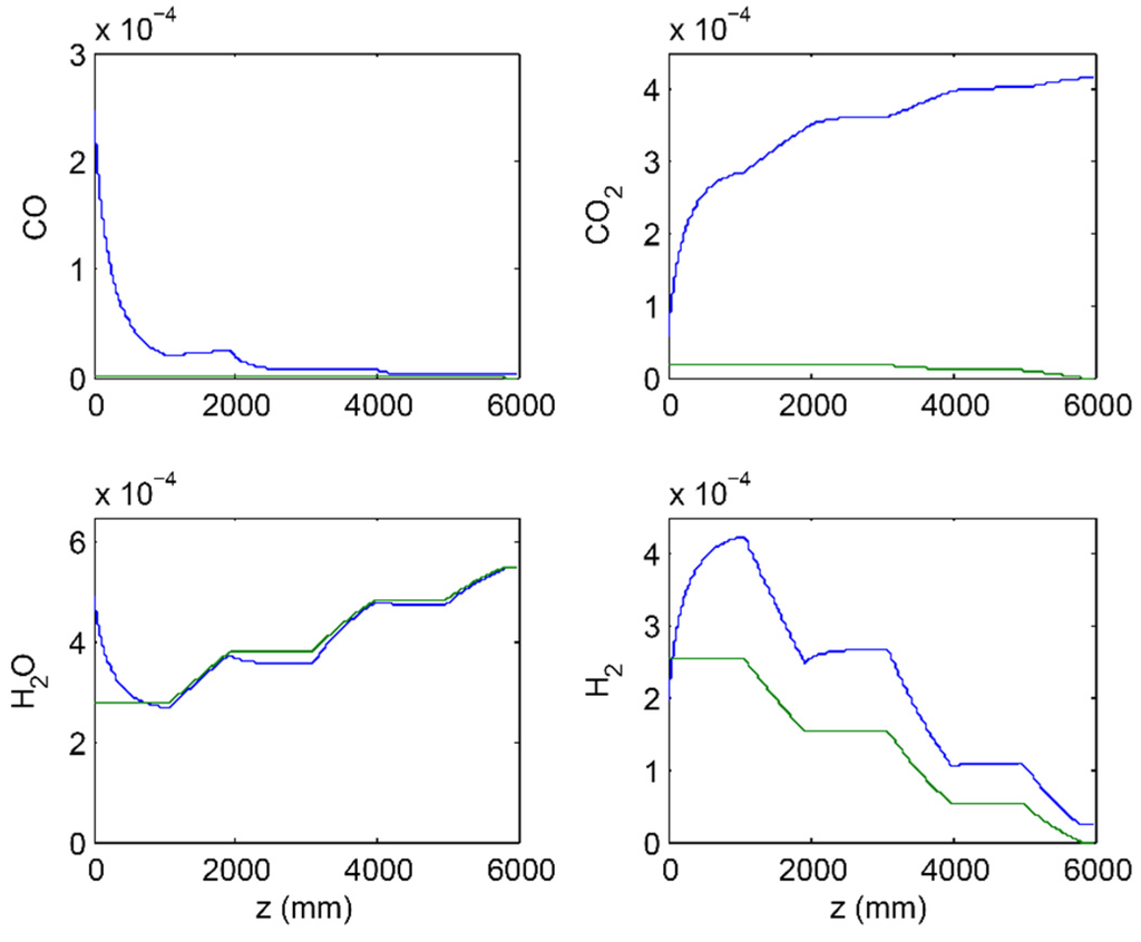 Species concentration (mol/cm3) profiles as function of axial length in tube (solid blue line) and shell (solid green line) for the solution vector shown above (optimized MR with αH2/CO2 = 60).