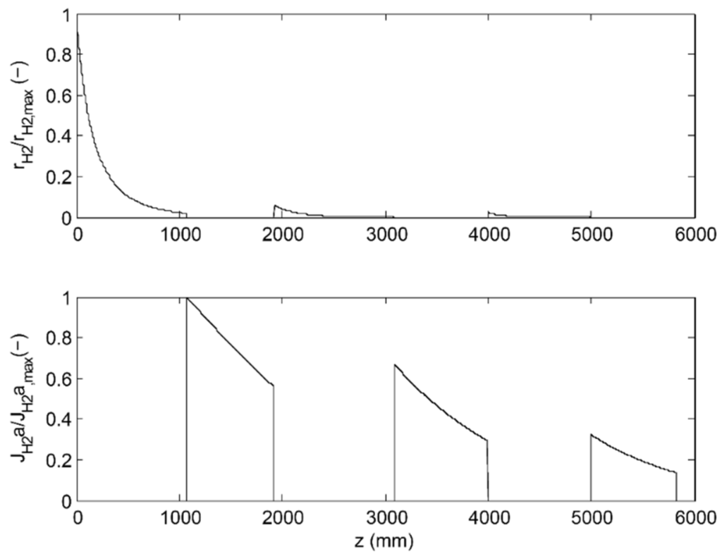 H2 reaction (rH2) and diffusion (JH2a, a ≡ 4/dt) rates for the optimized 3-stage PSMR (αH2/CO2 = 60); dimensionless quantities scaled by the maximum H2 reaction and diffusion rates, respectively.