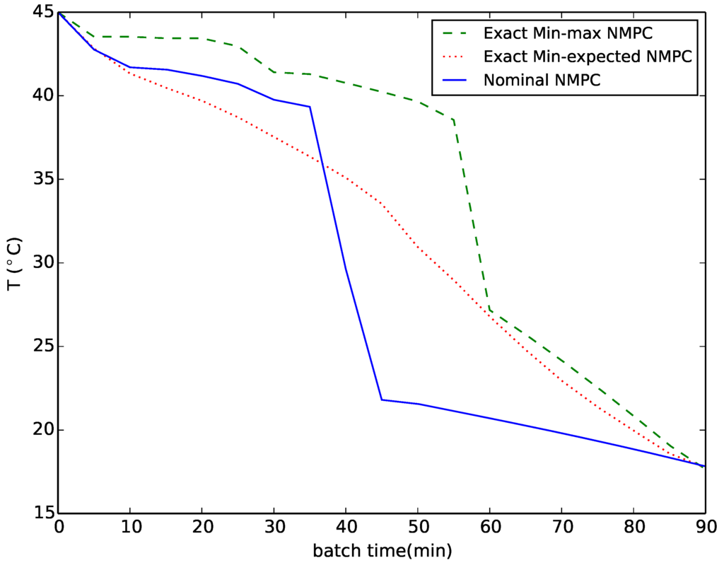 Despite the high fidelity obtained with nonlinear models based on first principles, there are still uncertainties associated with external and internal disturbances. A decision made without a consideration of these uncertainties might not only result in low-quality products but also carry the risk of violating some safety constraints. In order to deal with the parameter uncertainties, robust NMPC minimizes the expected or worst-case performance. For a batch process controlled by robust NMPC minimizing the expected performance, we solve with the following objective instead of (2):