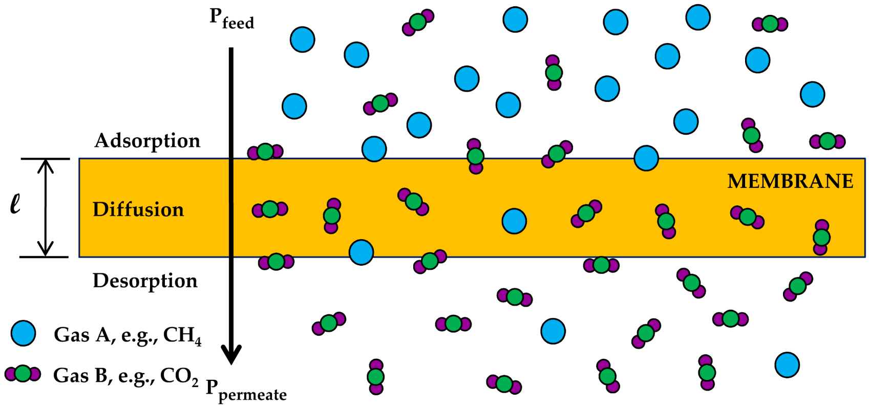 Gas transport in polymer membranes according to the solution-diffusion model showing the adsorption, diffusion, and desorption of the gas molecules through a membrane with thickness l.