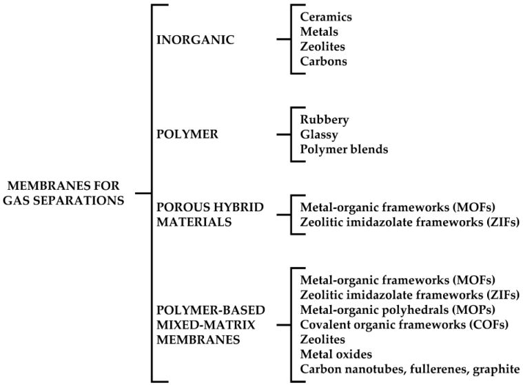 The potential application of membranes to gas separations has become an important technological advance in recent years owing to their reduced energy consumption and ease of operation when compared to traditional separation processes (e.g., cryogenic distillation, pressure and temperature swing adsorption, amine absorption, etc.), which are typically energy intensive processes. The simplicity of a membrane-based gas separation plant results in a footprint smaller than that required for other separation processes, making it an attractive alternative. A variety of industrial, energy, and environmental membrane-based gas separation applications have been targeted, some already at the industrial scale. Separations such as H2/N2, H2/CO2, He/H2, CH4/CO2, N2/CO2, O2/N2, NH3/H2/N2, N2/CH4, C3H6/C3H8 [11], C3H8/N2 [5], C3H6/C3H8/N2 [12], and C2H4/C2H6 [8,9], and other organic vapors [30,31,32,33,34,35,36,37,38,39,40,41,42,43,44,45,46,47,48,49,50] are some examples of where membranes could be employed to provide a cost effective separation process [51,52]. Owing to the nature of membranes as barrier materials, the operating conditions required in industry to separate a particular gas mixture impose constraints and challenges on the materials and manufacturing processes required for a membrane to be successfully used in industry. These limitations, however, open the possibility for improvements in the preparation and selection of materials for the fabrication of membranes resulting in a variety of membrane types as shown in Figure 2.