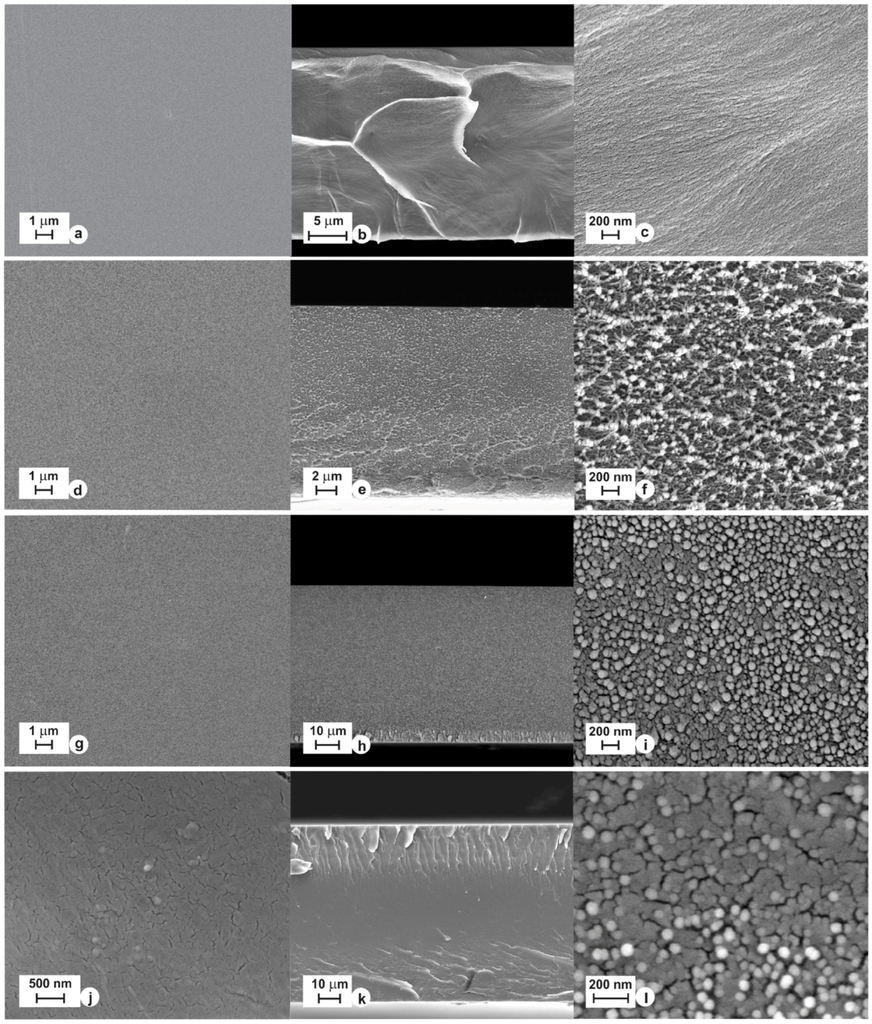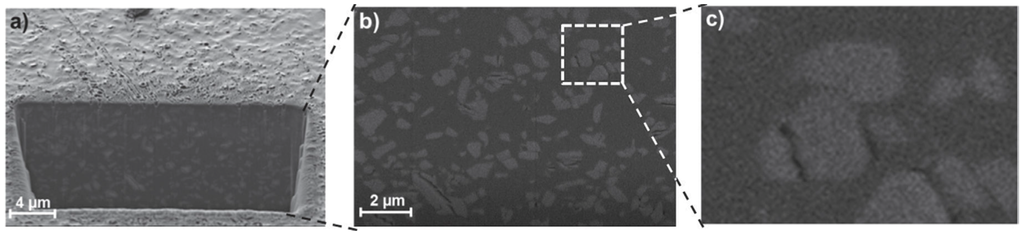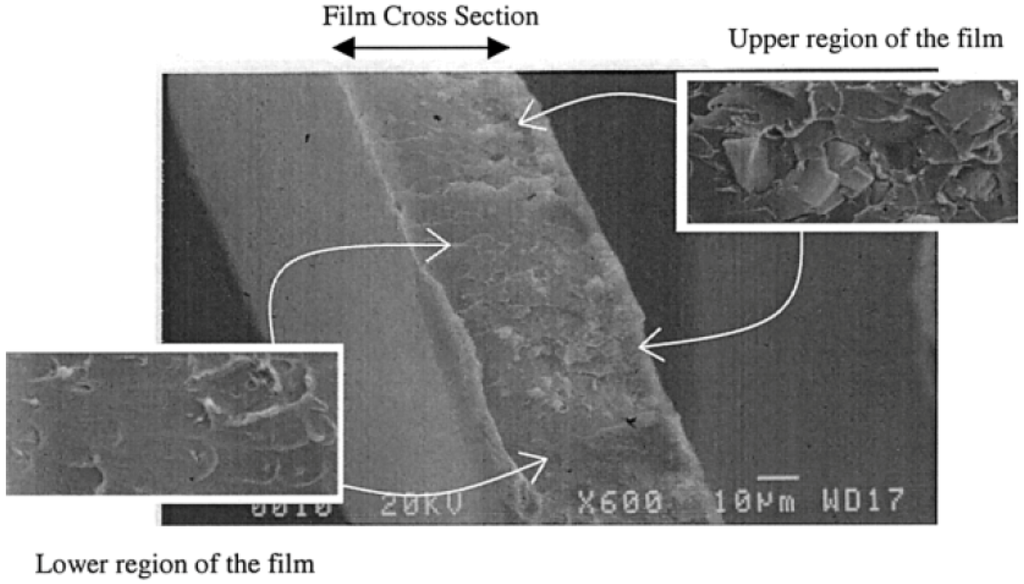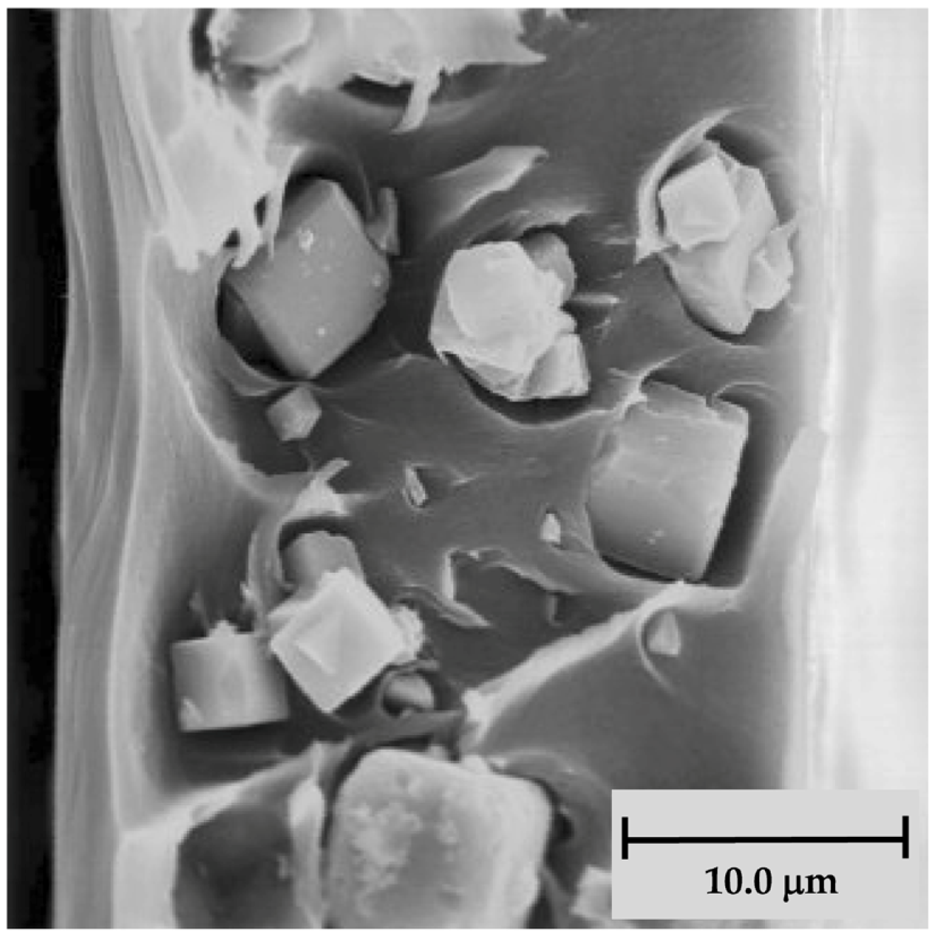 There were just a handful of publications on inorganic material-based MMMs before 2001. However, the ten-year period from 2001 to 2010 turned out to be the emerging period for incorporating inorganic materials into MMMs for gas separation applications. Many publications and patents were published showing improved results for gas separations. Although higher permeabilities could be achieved by increasing the amount of inorganic material, the mechanical stability of the membranes was reduced. During this period, several different studies were carried out to address this issue by improving polymer-additive interactions in order to improve the mechanical characteristics of the respective MMMs. In one such study, the plasticizer di-butyl phthalate was used together with zeolite 4A in a Matrimid® polymer matrix [142]. In addition to incorporating plasticizers, the membranes were formed at elevated temperatures to ensure the reactivity of the plasticizer and the polymer. As shown in Figure 11, the lower region of the membrane shows better contact between the zeolite particles and the polymer matrix.