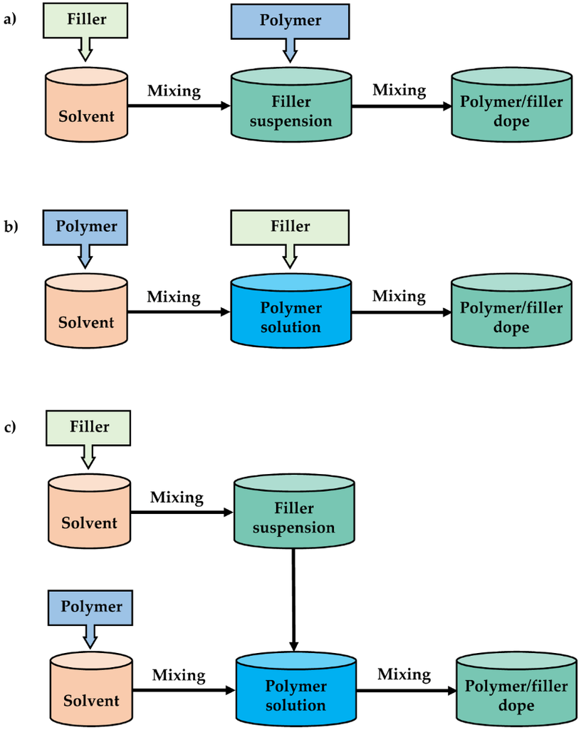 Methods for MMM solution preparation: (a) Polymer added to additive dispersion; (b) additive added to polymer solution; (c) mixing of additive suspension and polymer solution. Adapted with permission from [55]. Copyright, 2010, Elsevier.
