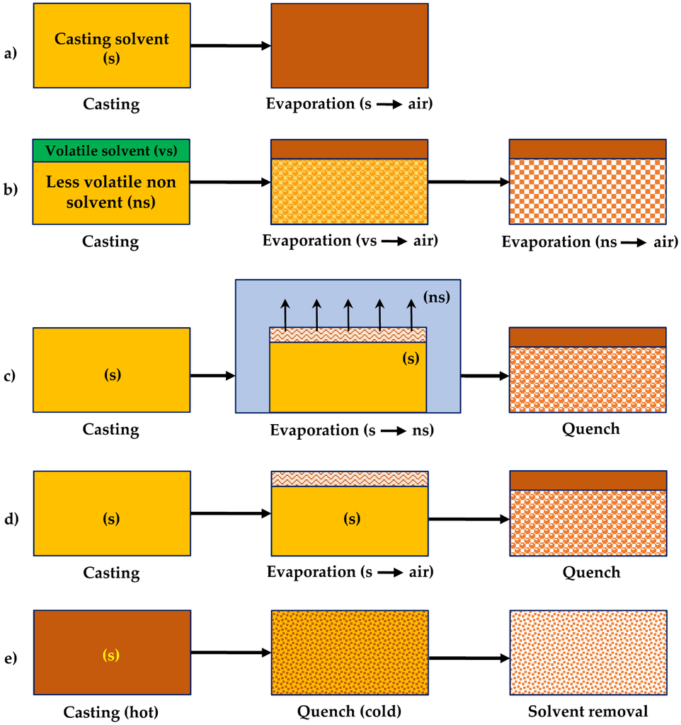 Techniques for membrane fabrication: (a) solution casting; (b) dry phase inversion; (c) wet phase inversion; (d) dry/wet phase inversion; and (e) thermally induced phase separation [56].