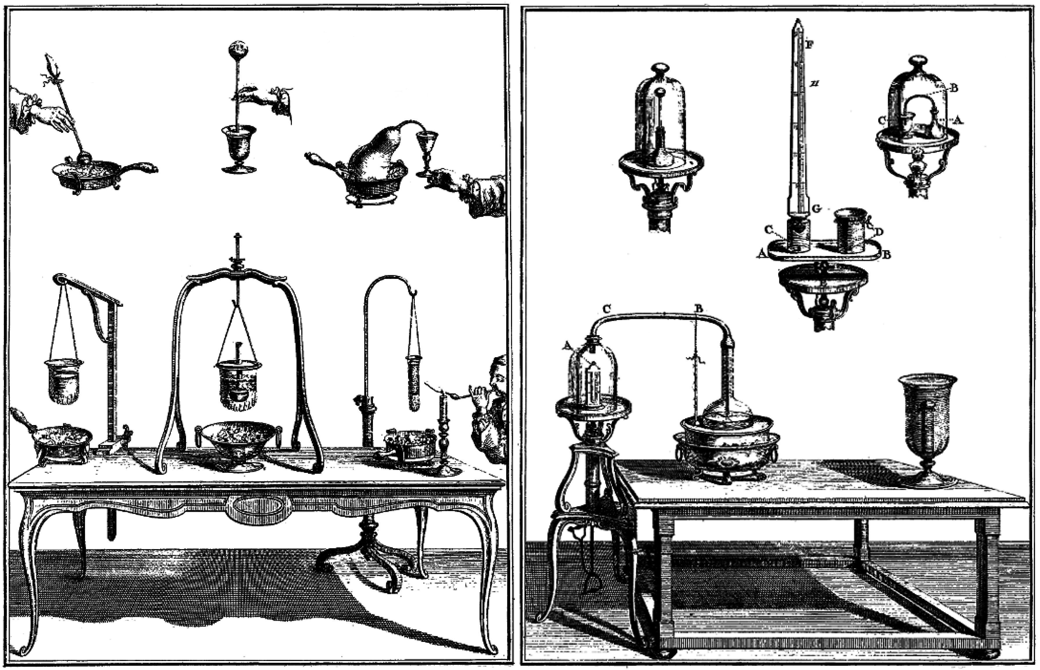 Nollet’s illustrations of experimental setups and apparatuses for the study of water and ethanol permeation in pig bladders [64].