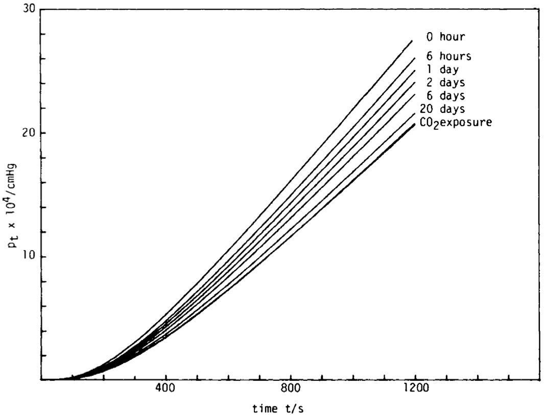 Time dependence of physical aging on the permeability of CO2 in polyvinyl acetate (PVAc) at 10 °C and 0.13 bar. Reproduced with permission from [102]. Copyright, 1985, Wiley.