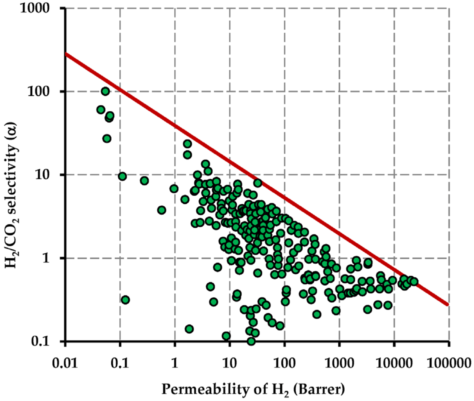 Updated (2008) Robeson’s upper bound for H2/CO2. The x-axis corresponds to the most permeable gas. Adapted with permission from [118]. Copyright, 2008, Elsevier.