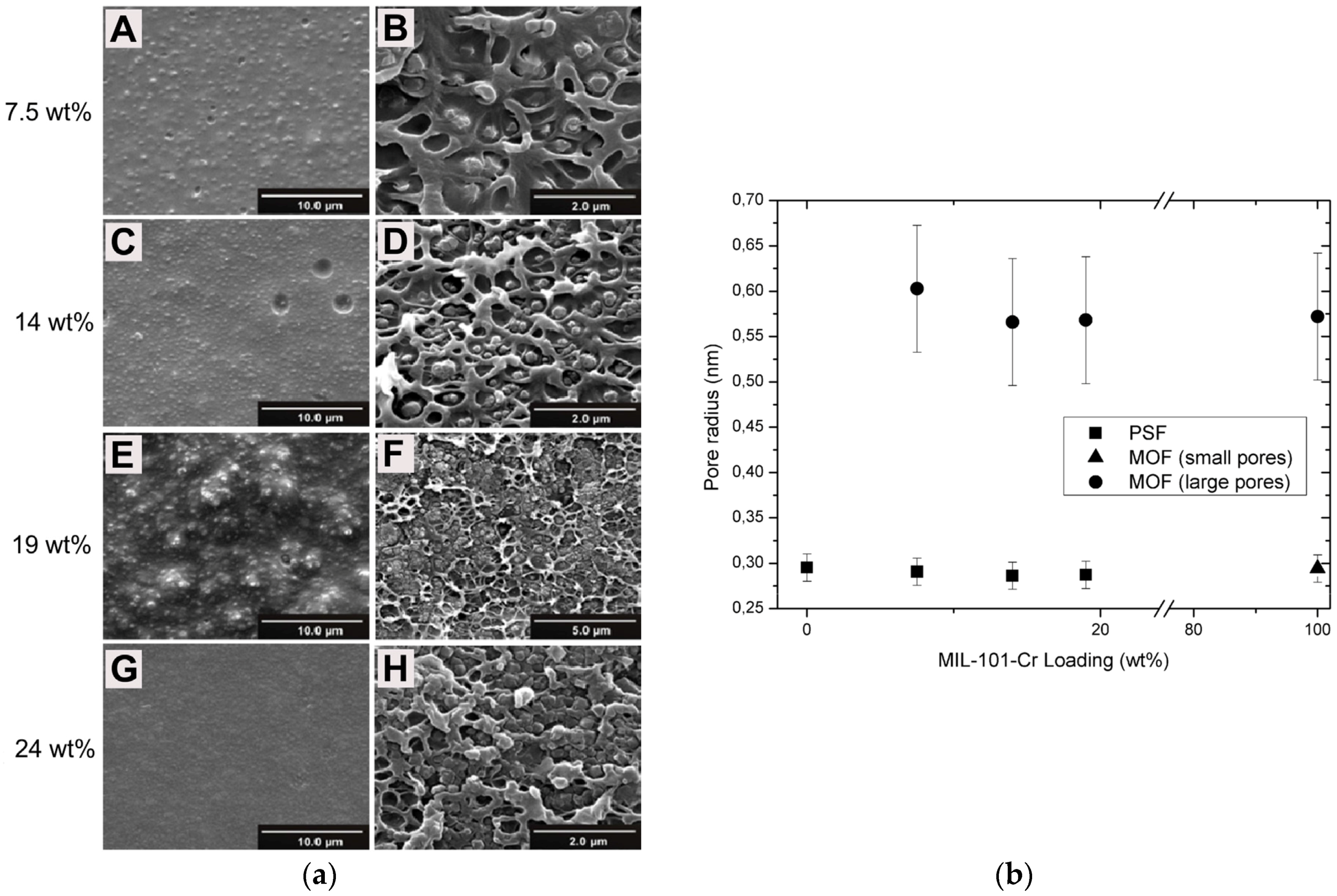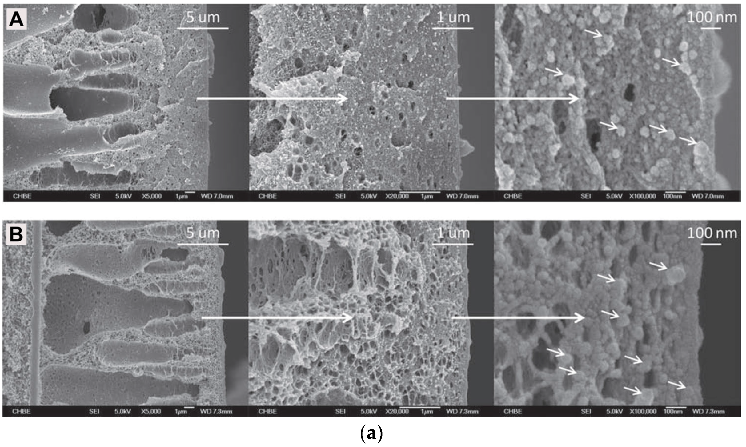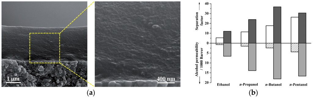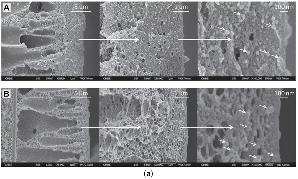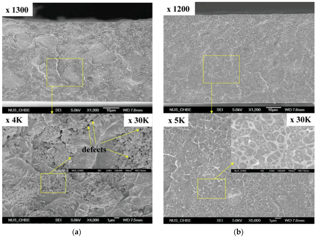 SEM images of the cross-sections of (a) polyethersulfone (PES)-zeolite 4A MMM; (b) sulfonated polyethersulfone (SPES)-zeolite 4A MMM. Reproduced with permission from [165]. Copyright, 2007, Wiley.