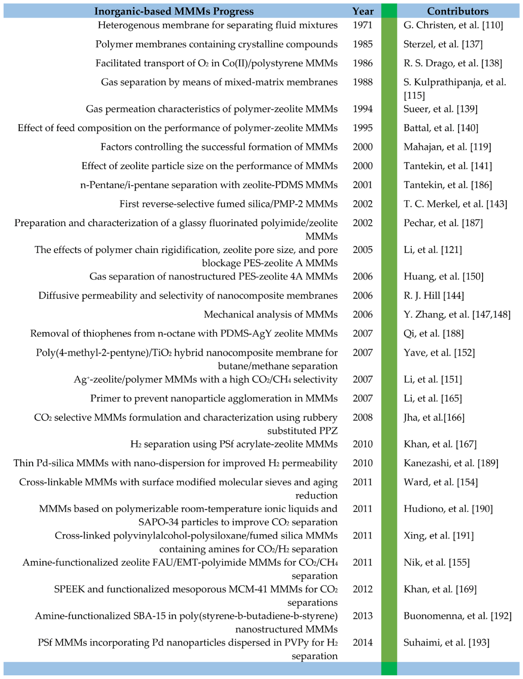 Chronological progress for inorganic-based MMMs.