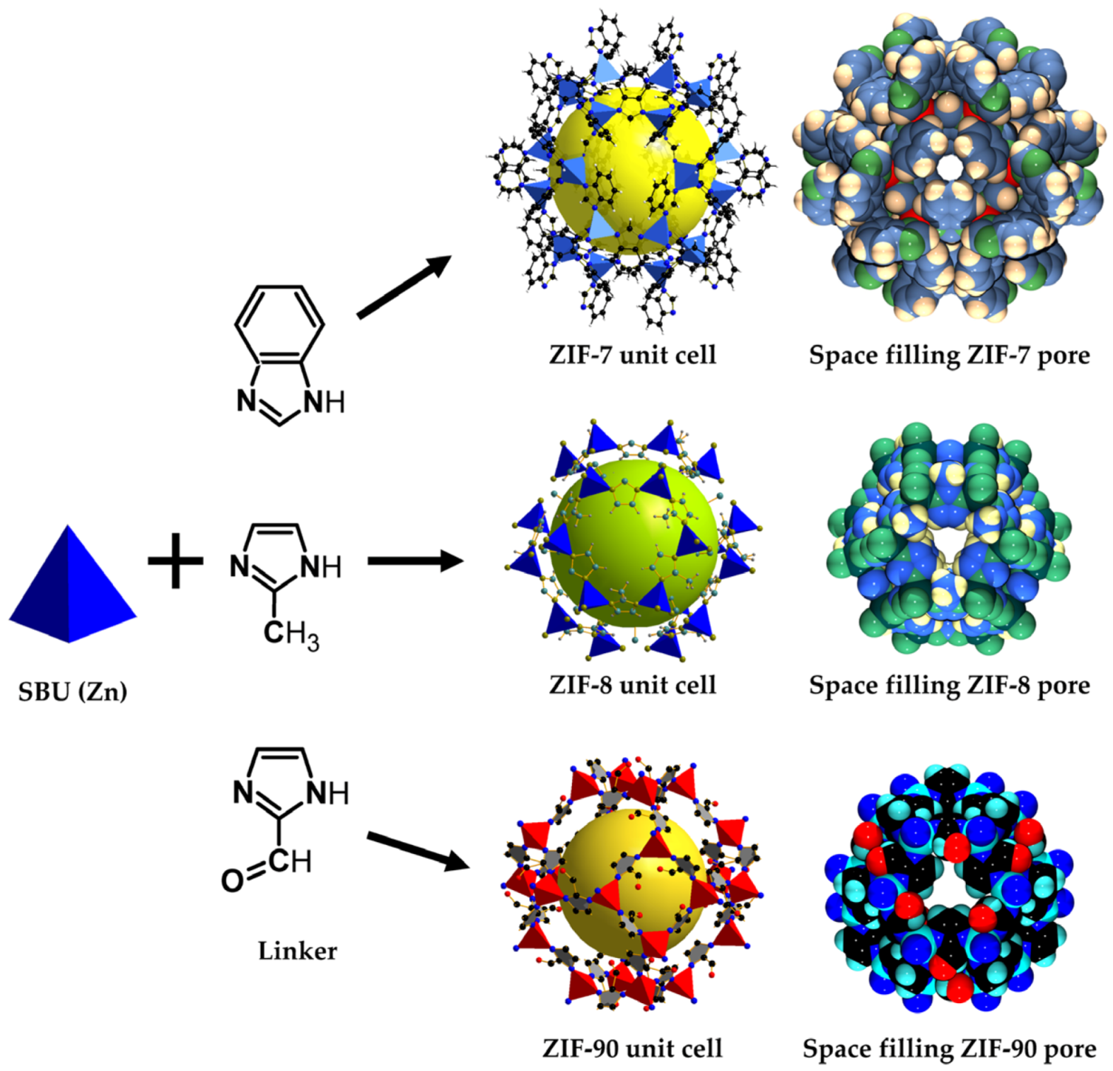 Synthesis of zeolitic imidazolate 7 (ZIF-7), ZIF-8, and ZIF-90 from a Zn ion and imidazolates. Unit cells and space filling models drawn using Diamond with crystallographic data for ZIF-7 [199], ZIF-8 [200], and ZIF-90 [201]. Note that depending on the linker, different pore aperture shapes can be obtained.