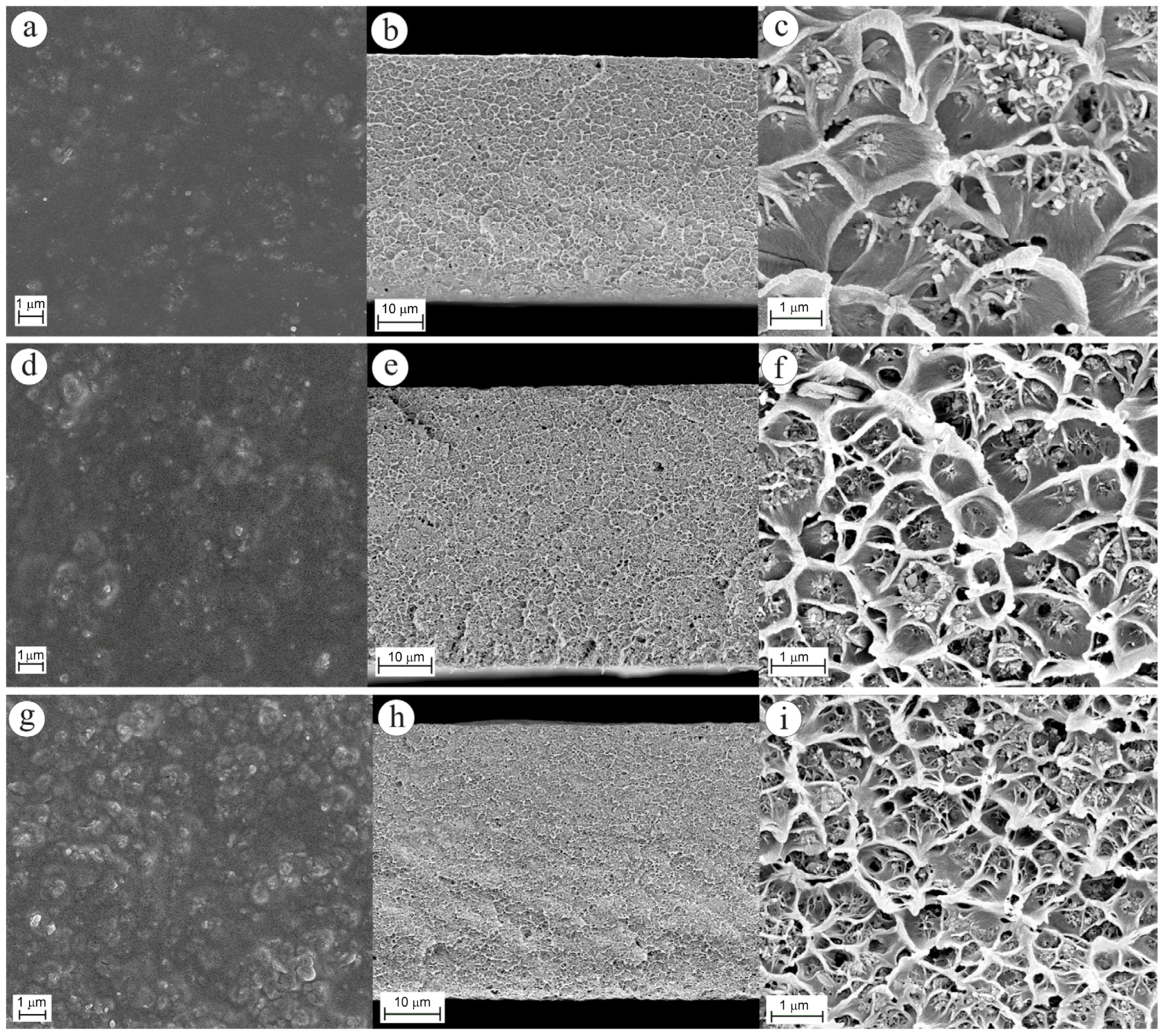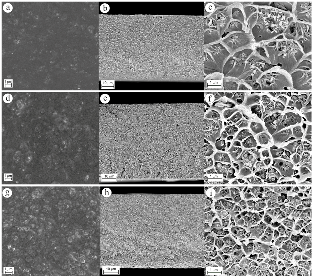 SEM images of the surface (a,d,g) and the cross-sections at low (b,e,h) and at high (c,f,i) magnifications of 10% (w/w), 20% (w/w), and 30% (w/w) MOF-5/Matrimid® MMMs, respectively. Cross-sections showing plastic deformation of the polymer matrix due to the presence of MOF-5 nanoparticles. Reproduced with permission from [124]. Copyright, 2009, Elsevier.