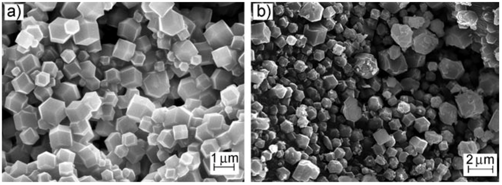 SEM images of submicrometer-sized ZIF-90 particles synthesized using nonsolvents: (a) methanol (ZIF-90A); (b) deionized water (ZIF-90B) [127]. Reproduced with permission from [127]. Copyright, 2010, Wiley.