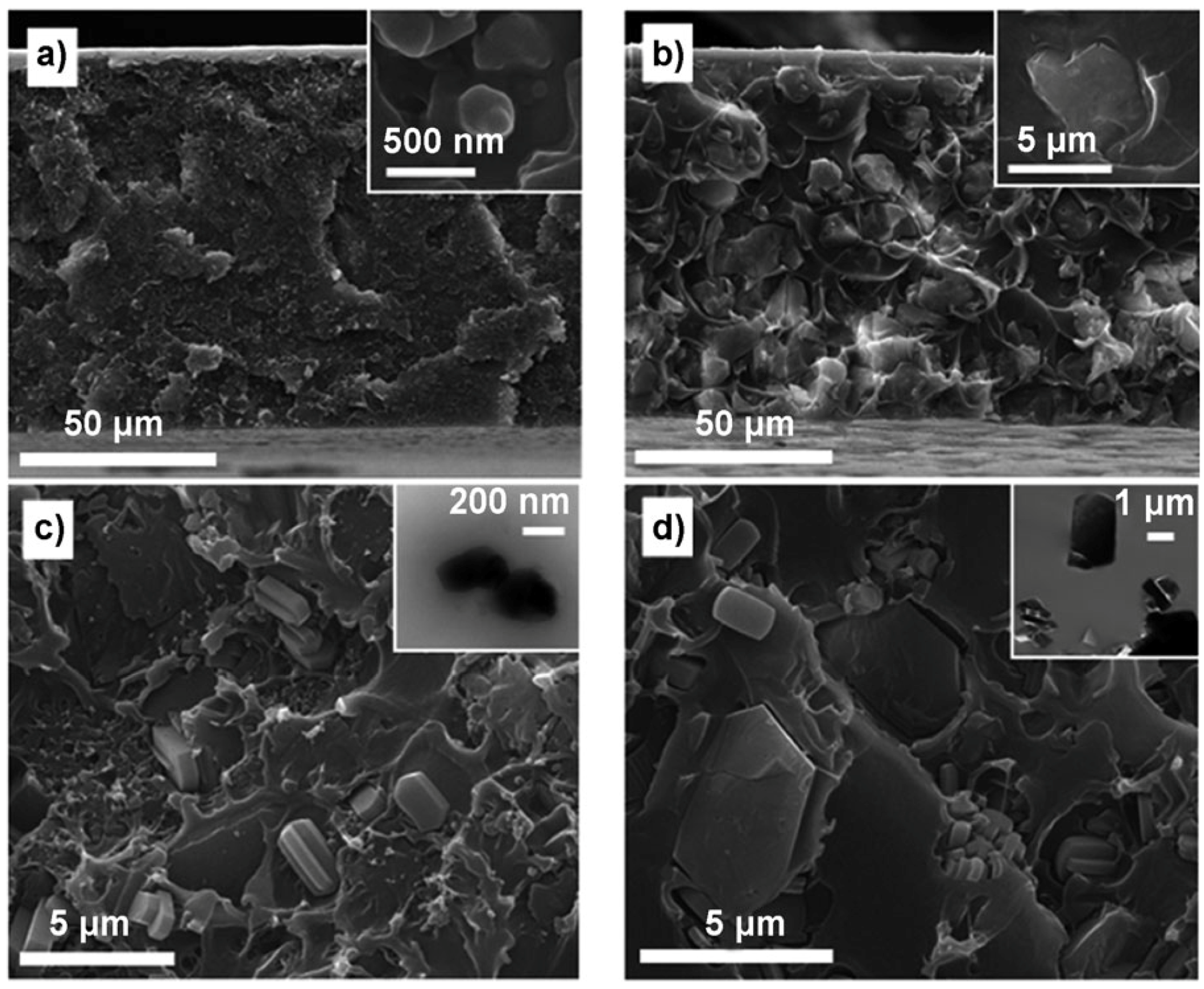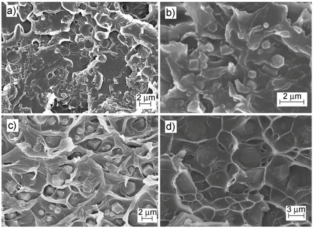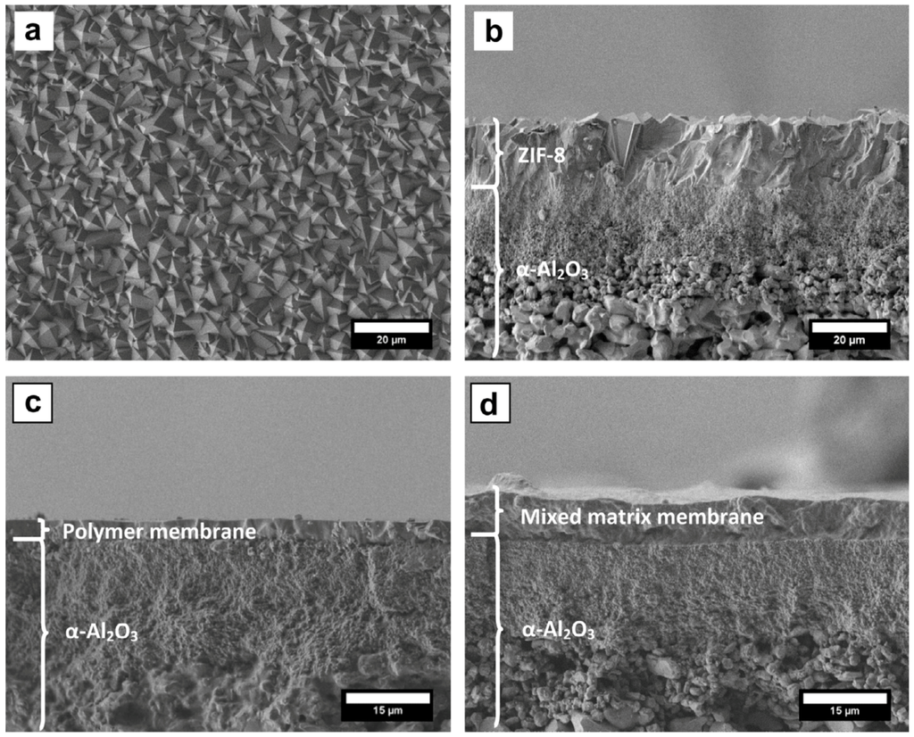 SEM images of cross-sections of 15 wt % ZIF-90/polyimide MMMs: (a) ZIF-90A/Ultem™; (b) ZIF-90A/Matrimid®; (c) ZIF-90A/6FDA-DAM; and (d) ZIF-90B/6FDA-DAM. Reproduced with permission from [127]. Copyright, 2010, Wiley.